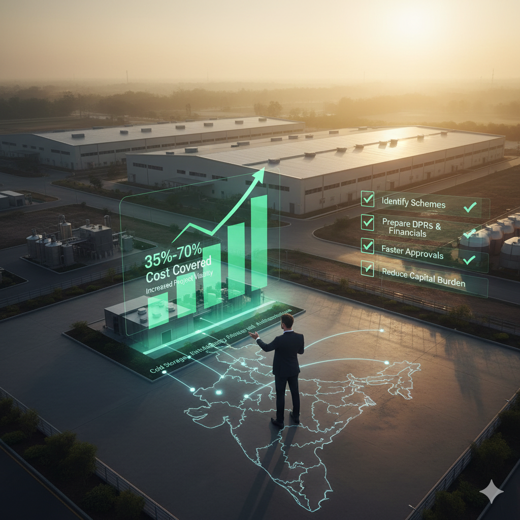 Government subsidies can cover 35% to 70% of eligible project costs, including plant & machinery, cold storage, processing infrastructure, quality certification, and export development.